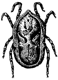 Рис. 21.3. Поселковый клещ Аргазовые клещи отличаются от иксодовых тем, что их ротовой аппарат располагается на вентральной стороне тела и совершенно не выступает вперед. Щитка на спинной стороне тела нет. Вместо него покровы снабжены многочисленными хитиновыми бугорками и бляшками и очень сильно растяжимы. По краю тела со всех сторон проходит широкий рант. Продолжительность жизни более 20 лет. Распространены в странах с теплым или жарким климатом. Часто встречаются в Закавказье и Средней Азии, причем не только в естественных биотопах, но и в антропогенных ландшафтах и даже в хозяйственных постройках и жилищах человека. В течение жизни питаются многократно и каждый раз на новом хозяине. В соответствии с этим самки в отличие от иксодовых клещей могут откладывать яйца несколько раз в жизни. Эволюция аргазовых клещей как кровососущих членистоногих связана с адаптацией к ним спирохет р.Borrelia, вызывающих у хозяев-прокормителей клещевые спирохетозы. Наибольшее значение из них имеет клещевой возвратный тиф. Спирохеты размножаются в кишечнике клеща и затем проникают во все внутренние органы, в том числе и в яичники, и передаются следующим поколениям клещей трансовариально. Циркуляция спирохет в очагах осуществляется с участием грызунов, собак и кошек. Домашний скот (коровы, лошади, овцы, верблюды) не участвует в передаче возбудителя, но, привлекая к себе клещей для питания, способствует возникновению популяций с высокой плотностью переносчиков, что и повышает вероятность заражения человека. Попадание спирохет в организм человека происходит не только через хоботок при укусе, но и непосредственно через кожу из экскрементов и продуктов выделения клещей. Имеется несколько клинических вариантов клещевого возвратного тифа. Это зависит от вида возбудителя, причем разные виды спирохет передаются специфическими переносчиками — разными видами аргазовых клещей. Среднеазиатский возвратный тиф вызывает спирохета Borrelia sogdiana, ее переносчиком является поселковый клещOmithodorus papillipes (рис. 21.3). Болезнь характеризуется периодическими лихорадочными приступами и воспалительными явлениями в дыхательной системе, а также поражениями центральной нервной системы. Обычно заболевание заканчивается выздоровлением через 2,5—4 мес. с момента заражения. Более опасен восточноафриканский клещевой возвратный тиф, сопровождающийся менингитами и параличами. Надсемейство Гамазовые клещи Gamasoidea — очень мелкие клещи, размером от 0,2 до 2,5 мм. Ведут хищнический или эктопаразитический образ жизни. Некоторые виды даже приспособились к эндопаразитиз-му. Все тело покрыто длинными щетинками. Ноги длинные и очень хорошо развиты. Хелицеры у паразитических видов превращены в колющие стилеты. Множественные укусы паразитических гамазовых клещей вызывают у человека местные поражения кожи — дерматиты. Ряд клещей этой группы имеют значение как переносчики возбудителей некоторых вирусных, риккетсиозных и бактериальных заболеваний. Наиболее известны среди них крысиный сыпной тиф, вирус которого передается клещомOmithonyssus bacoti, риккетсиоз Q — лихорадка, передающаяся куриным клещомDermanyssus gallinae (рис. 21.4 А, Б ), а также туляремия, в переносе которой участвуют гамазовые клещи, паразитирующие на водяных крысах. Семейство Краснотелковые клещи Trombiculidae включает ряд видов, имеющих 