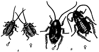 Рис. 21.7. Организация насекомого: а — голова, б — грудь, в — брюшко; 1 — ротовой аппарат, 2 — органы чувств, 3 — нервная система, 4 — крылья, 5 — кровеносная система, 6 — пищеварительная трубка, 7 — половые органы, 8 — мальпигиевы сосуды 21.2.1. Синатропные насекомые, не являющиеся паразитами К этой группе насекомых относят виды, которых привлекает своеобразие экологических условий человеческого жилища: постоянство действия микроклиматических факторов и независимость от сезонных изменений условий в природе, наличие постоянных источников питания и многочисленных убежищ. Поэтому адаптации у этих животных затрагивают в первую очередь поведенческие реакции — изменение инстинкта откладки яиц, предпочтение закрытых помещений и т. д. Эти насекомые связаны с человеком и его предками менее тесно по сравнению с другими группами и относительно недолго — с момента начала использования гоминидами естественных убежищ и строительства примитивных жилищ. В связи с этим регрессивной морфофизиологической эволюции они не претерпели. Большинство таких насекомых — теплолюбивые виды тропического и субтропического происхождения, относящиеся к разным отрядам и семействам. Медицинское значение из них имеют лишь те, которые используют продукты питания, пищевые отходы или фекалии человека. Большинство из видов насекомых этой экологической группы являются механическими переносчиками возбудителей инфекционных и паразитарных заболеваний. Вирусы, бактерии, цисты простейших и яйца гельминтов переносятся ими на лапках, поверхности тела или в пищеварительной системе, не развиваясь и не размножаясь. В организме некоторых видов насекомых развиваются личиночные стадии ряда гельминтов (см. разд. 20.1.2.3). К насекомым этой группы относятся тараканы, а также синантропные мухи, муравьи и жуки. Основными мерами борьбы с синатропными насекомыми являются благоустройство жилища и поддержание в нем постоянной чистоты, хранение продуктов питания в недоступных для насекомых местах, в закрытой таре. Тараканы — всеядные насекомые довольно крупных размеров. В тропиках и субтропиках встречаются как в естественной природе, так и в жилище человека. Здесь же наиболее велико их видовое разнообразие. В умеренных широтах распространены только два вида — черный таракан Blatta orientalis и рыжий таракан Blattella germanica (рис. 21.8). Размеры черного таракана 19—26 мм, цвет черно-бурый. Рыжий таракан значительно мельче—до 11—12 мм, цвет его рыжеватый. Тело тараканов уплощено, на лапках имеются коготки и присоски, благодаря которым эти насекомые проникают в узкие щели и ползают в любом положении. Крылья их недоразвиты, и поэтому летать они почти не могут. Развиваются тараканы, откладывая коконы, содержащие до 20 яиц. За 20—50 сут завершается эмбриональное развитие, и из оболочки кокона выходят мелкие светлые личинки. До достижения половой зрелости они линяют несколько раз. Питаются тараканы любыми пищевыми продуктами, а также кожей, бумагой, ватой и шерстью.