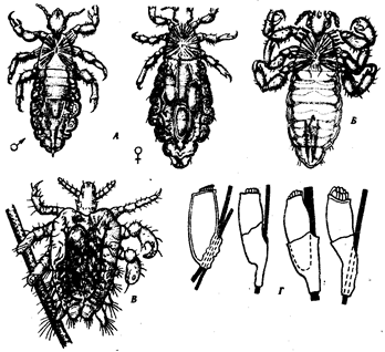 Рис. 21.16. Вши. А — головная; Б — платяная; В — лобковая; Г — гниды вшей Кроме разных мест обитания на человеке вши отличаются друг от друга морфологическими и физиологическими признаками и особенностями жизненного цикла. Самая крупная вошь — платяная. Ее размеры до 4,7 мм. Головная достигает длины 3 мм, а лобковая — не более 1,5 мм. Платяная и головная вши имеют четко отграниченные друг от друга головку, грудь и брюшко, а у лобковой грудь и брюшко слиты. Платяная вошь живет около 50, головная — около 40, а лобковая — до 30 сут. Головная и платяная вши питаются кровью по 2—3 раза в сутки, а лобковая — почти постоянно малыми порциями. Самка платяной и головной вшей откладывает до 300 яиц за всю жизнь, лобковой — до 50. Яйца приклеиваются к волосам или нитям одежды и называются гнидами. Они очень устойчивы. Слюна вшей обладает токсическими свойствами. Она вызывает ощущение жжения и зуда. У некоторых людей на укусы этих насекомых могут развиваться аллергические реакции. На месте укусов остаются поверхностные кровоизлияния. Ссадины на местах расчесывания инфицируются и загнаиваются. Волосы на голове при этом склеиваются, и образуется трудноизлечиваемое болезненное состояние — колтун. Лобковая вошь является только паразитом, а головная и платяная — еще и специфическими переносчиками спирохетBorrelia reccurentis — возбудителей возвратного тифа, риккетсийRicketsia prowaceki — возбудителей эпидемического сыпного тифа, R. wolhynica — возбудителей волынской лихорадки. Спирохеты размножаются и развиваются в полости тела вшей, поэтому заражение происходит при раздавливании паразитов и попадании их гемолимфы в ранку от укуса или в расчесы. Риккетсий размножаются в стенке кишечника вшей и выделяются оттуда с фекалиями. Заражение человека происходит при попадании фекалий вшей с риккетсиями в кожные ранки или на слизистые оболочки глаз и дыхательных путей. В связи с тем что риккетсий сохраняют жизнеспособность в сухом виде в течение нескольких месяцев, возможно заражение человека ими без укуса вшами, например при контакте с одеждой больных, в складках которой сохранились сухие фекалии или мертвые насекомые. Профилактика описанных инфекционных заболеваний — это в первую очередь борьба с педикулезом. Основная мера профилактики педикулеза — соблюдение правил личной гигиены, особенно в местах массового скопления людей. Из химических средств уничтожения вшей используют мази и шампуни, содержащие инсектициды, а также лекарственные препараты, применяемые внутрь и действующие через кровь, которой питаются эти паразиты. Наиболее эффективны короткая стрижка для уничтожения гнид и обработка белья в дезинфекционных камерах. 21.2.4. Насекомые — тканевые и полостные эндопаразиты В связи с высоким уровнем организации насекомых эндопаразитический образ жизни для них не характерен. Однако личинки ряда видов из отряда Двукрылые развиваются в трупах, гниющих остатках органического вещества, в почве. Некоторые из них приобрели адаптации к паразитическому образу жизни, поселяясь как в полостных органах, так и в тканях внутренней среды. Личинки этой группы двукрылых способны к анаэробной диссимиляции и к передвижению внутри организма хозяина. Окукливание происходит во внешней среде, а взрослые формы ведут свободный образ жизни и мало отличаются от большей части других дву