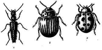 Рис. 21.9. Синантропные мухи. А — комнатная; Б — синяя мясная; В — зеленая падальная; Г — серая мясная Жуки. В отличие от тараканов, мух и домовых муравьев жуки из рода Tenebrio (рис. 21.10) не являются, за редким исключением, переносчиками возбудителей заболеваний. Они обитают в муке и крупе, подвижность их невысока. Представляют интерес в связи с тем, что в них развивается личиночная стадия карликового цепня — цистицеркоид (см. разд. 20.1.2.3). Заражение человека гименолепидозом может произойти при пропитывании инвазированного жука или его личинки с непропеченным хлебом или кондитерскими изделиями.