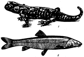 Рис. 23.3. Пассивноядовитые животные. А— жук стафилин береговой; Б— колорадский жук; В — бахчевая коровка; Г— саламандра огненная; Д— маринка балхашская 23.1. ПРОИСХОЖДЕНИЕ ЯДОВИТОСТИВ ЖИВОТНОМ МИРЕНа ранних этапах эволюции в качестве ядов могли выступать нормальные метаболиты, выделяющиеся в окружающую среду или накапливающиеся в организме. Эволюционно наиболее примитивная форма ядовитости — накопление токсичных метаболитов в организме, . т. е. первичная пассивная ядовитость. У животных, не имеющих иных способов защиты или нападения, в соответствии с правилом прогрессивной специализации могут появляться специализированные структуры, продуцирующие яд: за счет усиления защитной функции покровных клеток (у кольчатых червей, кишечнополостных, иглокожих) или за счет активизации работы и расширения функций желез внешней или внутренней секреции. Так, ядовитые железы змей являются преобразованными слюнными железами. Ядовитый аппарат перепончатокрылых насекомых — видоизмененная половая система самок. Пассивная, а также вторичная ядовитость почти не обеспечивают индивидуальной защиты животных, но ценой гибели одной особи повышают эффективность выживания популяции в целом. Использование ядовитости в сочетании с наличием аппарата введения яда является несомненно прогрессивным признаком с морфофизиологической точки зрения. Большинство активноядовитых животных вырабатывают яды, представляющие собой смеси токсических полипептидов и литических ферментов. Таковы яды змей и пауков. Их токсины по происхождению связаны с пищеварительными ферментами слюнных желез, обладающих повышенной литической активностью. Они действуют только при попадании их в кровь. При введении их в пищеварительную систему они расщепляются и теряют токсический эффект. Невооруженные активноядовитые животные в большинстве случаев имеют яды небелковой природы. Поэтому они наиболее эффективно действуют при попадании в пищеварительную систему. Хищнический образ жизни ядовитых животных сопровождается обычно возникновением вооруженной формы ядовитого аппарата, а токсины обладают нейротропным действием, направленным в первую очередь на обездвиживание жертвы (змеи, скорпионы, осы). Нередко нейротоксины обладают строгой специфичностью действия, соответствующей пищевой специализации животного. Так, яд наездников парализует практически лишь гусениц, которыми питаются личинки этих хищников. В яде скорпионов возникли видоспецифичные нейротоксины, избирательно действующие на млекопитающих, насекомых и ракообразных. У невооруженных ядовитых животных яды в основном обладают отпугивающим действием. Химическая природа их разнообразна, что свидетельствует о разных путях их происхождения. Это стероиды, органические кислоты и т. п. Такие яды встречаются у амфибий, жуков, некоторых многоножек и др. В процессе эволюции ядовитости параллельно с видоизменением токсинов, органов, их вырабатывающих, и механизмов введения в тело жертвы эволюционируют также и механизмы резистентности животных — производителей токсинов к собственным ядам. Наиболее известный из них — особое строение ядопродуцирующих желез, стенки которых препятствуют распространению токсинов по организму. Нередко яды вырабатываются вместе с их ингибиторами и поэтому в таком виде не п