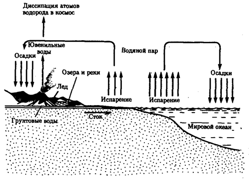 Рис. 24.2. Круговорот воды в биосфере Под влиянием этого процесса происходит постепенное разрушение литосферы, перенос ее компонентов в глубины морей и океанов. На создание органического вещества расходуется всего 0,1—0,2% солнечной энергии, достигающей поверхности планеты. Благодаря этой энергии осуществляется значительный объем работы по перемещению химических элементов. В качестве примеров биотического круговорота рассмотрим круговороты углерода и азота в биосфере (рис. 24.3; 24.4). Круговорот углерода начинается с фиксации атмосферного диоксида углерода в процессе фотосинтеза. Часть образовавшихся при фотосинтезе углеводов используют сами растения для получения энергии, часть потребляется животными. Углекислый газ выделяется в процессе дыхания растений и животных. Мертвые растения и животные разлагаются, углерод их тканей окисляется и возвращается в атмосферу. Аналогичный процесс происходит и в океане. Круговорот азота также охватывает все области биосферы (рис. 24.4). Хотя его запасы в атмосфере практически неисчерпаемы, высшие растения могут использовать азот только после соединения его с водородом или кислородом. Исключительно важную роль в этом процессе играют азотфиксирующие бактерии. При распаде белков этих микроорганизмов азот снова возвращается в атмосферу. Показателем масштаба биотического круговорота служат темпы оборота углекислого газа, кислорода и воды. Весь кислород атмосферы проходит через организмы примерно за 2 тыс. лет, углекислый газ — за 300 лет, а вода полностью разлагается и восстанавливается в биотическом круговороте за 2 млн. лет (рис. 24.5).