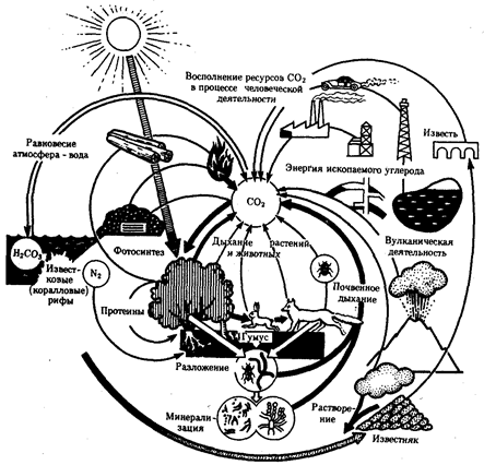 Рис. 24.5. Темпы циркуляции веществ в биосфере 24.3. ЭВОЛЮЦИЯ БИОСФЕРЫЭволюция биосферы на Протяжении большей части ее истории осуществлялась под влиянием двух главных факторов: естественных геологических и климатических изменений на планете и изменений видового состава и количества живых существ в процессе биологической эволюции. На современном этапе в третичном периоде к ним присоединился третий фактор — развивающееся человеческое общество. Этапы возникновения жизни, пути и механизмы ее эволюционного развития рассмотрены выше (см. гл. 1). Жизнь зародилась на Земле свыше 3,5 млрд. лет назад. Первыми живыми существами были анаэробы, которые получали энергию путем брожения. Так как брожение представляет собой относительно малопродуктивный способ энергообеспечения, примитивная жизнь не могла эволюционировать далее одноклеточной формы организации. Питание таких примитивных организмов зависело от опускавшихся на дно водоемов органических веществ, синтезируемых в поверхностных слоях воды абиогенным способом. Недостаток органических веществ создал давление отбора, приведшее к возникновению фотосинтеза. Прогрессивное увеличение кислорода в воде за счет жизнедеятельности фотосинтезирующих организмов и его диффузии в атмосферу вызвало изменения в химическом составе оболочек Земли, прежде всего атмосферы, что в свою очередь сделало возможным и развитие более сложно организованных живых форм и быстрое распространение Жизни по планете. По мере увеличения содержания кислорода в атмосфере формируется достаточно мощный слой озона, защищающий поверхность Земли от проникновения жесткого ультрафиолетового излучения. В таких условиях жизнь смогла продвинуться к поверхности моря. Развитие механизма аэробного дыхания сделало возможным появление многоклеточных организмов. Примечательно, что первые такие организмы появились после того, как концентрация кислорода в атмосфере планеты достигла примерно 3%, что произошло около 600 млн. лет назад (начало кембрия). Благодаря способности фотосинтезирующих морских организмов продуцировать такое количество кислорода, которое превышало потребности в нем обитателей планеты, стало возможным возникновение в процессе эволюции организмов более высокого уровня структурно-физиологической организации, их широкое расселение и проникновение Жизни в различные сферы обитания. В течение палеозойской эры живые существа не только заселили все моря, но и вышли на сушу. Развитие зеленых растений обеспечило образование больших количеств кислорода и органических веществ, что создавало благоприятные условия для последующей прогрессивной эволюции. В середине палеозоя темпы потребления кислорода живыми организмами и расход его в абиотических процессах, а также темпы его образования сравнялись. Содержание кислорода в атмосфере начиная с этого периода истории Земли стабилизировалось на уровне примерно 20%. С появлением человеческого общества в развитии биосферы намечается переход от биогенеза, обусловленного факторами биологической эволюции, к ноогенезу — развитию под влиянием разумной созидательной деятельности человечества. ГЛАВА 25УЧЕНИЕ О НООСФЕРЕ25.1. БИОГЕНЕЗ И НООГЕНЕЗЭволюция органического мира прошла несколько этапов. Первый из них — возникновение первичной биосферы с биотиче