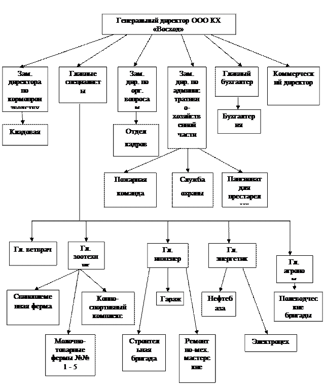 2 Организационно-экономическаяхарактеристика ООО КХ «Восход»2.1 Общие сведения об организацииОбщество с ограниченной ответственностью «Восход» республики Адыгея создано на базе акционерного сельскохозяйственного общества «Восход» в июле 1992 г. Обществу присвоен основной государственный регистрационный номер 1032301301647, о чем внесена запись в Единый государственный реестр юридических лиц с выдачей Свидетельства № 003273406 серия 01. Общество создано без ограничения срока его деятельности. Хозяйство является юридическим лицом, действует на основании устава и Законодательства Российской Федерации. Место нахождения общества: республика Адыгея, пос. Победы, ул. Тенистая, 9/а. Хозяйство осуществляет следующие основные виды деятельности: - племенное свиноводство; племенное разведение крупного рогатого скота; племенное разведение лошадей; - семеноводство: зерновых, колосовых, бобовых, томатов, огурцов, лука, тыквы, арбузов, гибридных сортов кукурузы и т. п.; - производство, переработка и реализация сельскохозяйственной продукции; - заготовка и производство пиломатериалов, строительных материалов, развитие подсобных промышленных производств и промыслов, производство кирпича; - оказание различного вида услуг (транспортных, ремонтных, строительных, торгово-закупочных; - сдача в аренду помещений; - торговля, торгово-закупочная, снабженческо-сбытовая, посредническая, деятельность; - исследование и прогнозирование состояния цен на продукцию на рынке, биржах, производство бартерных сделок; - внешнеэкономическая деятельность; - производство товаров народного потребления и продуктов питания; - использование подземных и надземных вод в хозяйственной деятельности; - консультационное обслуживание (юридическое, бухгалтерское, финансовое, информационно-вычислительное, ветеринарное, агрономическое, зоотехническое, экономическое и т д.; - содействие и оказание спонсорской помощи, развитие спортивно-оздоровительных мероприятии; - иная деятельность, не запрещенная законом. ООО КХ «Восход» является юридическим лицом и имеет в собственности обособленное имущество, учитываемое на самостоятельном балансе. Общество может от своего имени приобретать и осуществлять имущественные и личные неимущественные права, нести обязанности, быть истцом и ответчиком в суде. Общество вправе в установленном порядке открывать банковские счета на территории Российской Федерации и за ее пределами. Хозяйство имеет круглую печать, содержащую его полное фирменное наименование на русском языке и указа на место его нахождения. Хозяйство вправе иметь штампы и бланки со своим наименованием, собственную эмблему, а та зарегистрированный в установленном порядке товарный знак и другие средства визуальной идентификации. Учредителями хозяйства являются физические лица - граждане России. 2.2 Структура производства и управленияОрганизационная структура ООО КХ «Восход» представлена на рисунке 3. Генеральный директор ООО КХ «Восход» занимается координацией деятельности хозяйства, принимает на работу и увольняет работников, заключает договора на поставку и продажу продукции юридическим лицам.