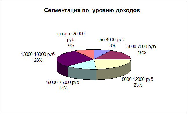 Рисунок 12 - Сегментация покупателей фирмы «Toodoors» по уровню доходов. Из представленных рисунков видно, что предпочтения потребителей разных фирм неодинаковы. Так, большинство покупателей ООО «Редут» (около 41 %) выбрали «мягкую дверь», а 76 % покупателей фирмы «Toodoors» - входную дверь, изготовленную из металла и ламината. Около 5 % покупателей дверей «Редут» готовы заплатить за входную дверь до 7 000 рублей, а 64 % - от 7 000 до 14 000 рублей. Около 56 % покупателей фирмы «Toodoors» потратят на входную дверь сумму, не превышающую 7 000 рублей, и 44 % - от 7 000 до 14 000 рублей. Уровень доходов покупателей данных фирм также отличаются друг от друга. Так, например, средний уровень доходов покупателя фирмы «Toodoors» составляет от 8 000 до 12 000 рублей, а покупателей ООО «Редут» - от 13 000 до 18 000 рублей. В дальнейшем эти сведения помогут лучше выбрать целевой сегмент и разработать стратегию маркетинга для конкретной фирмы. 3.1. Выбор фирмы, целевого сегмента, стратегия позиционирования. Из всех фирм, представленных в нашем городе и занимающихся изготовлением и продажей входных дверей, я решила выбрать ООО «Редут». По данным опроса фирма «Редут» известна 96,25 % респондентов; а предоставленными услугами воспользуются 23,75 % респондентов. «Редут» является одним из лидеров рынка входных дверей г. Череповца, но все же лидирующие позиции и треть всего рынка принадлежат стальным дверям «Toodoors». Выбор целевого сегмента. Целевыми сегментами являются наиболее привлекательные участки рынка или один сегмент, отобранный для реализации товаров. В зависимости от степени сегментации существуют три уровня маркетинговой политики: Массовый маркетинг - продавец занимается массовым производством, массовым распределением и массовым стимулированием сбыта одного и того же товара для всех покупателей сразу. Товарно - дифференцированный маркетинг - продавец производит два или несколько товаров с разными свойствами, в разном оформлении, разного качества, в разной расфасовке. Эти товары призваны не столько понравиться различным сегментам рынка, сколько создать разнообразие для покупателей. Целевой маркетинг - продавец производит различие между сегментами рынка, выбирает из них один или несколько и разрабатывает товары и комплексы маркетинга для отобранных сегментов Маркетинговое сегментирование вскрывает возможности различных сегментов рынка. На основе сегментирования фирме необходимо решить, сколько сегментов следует охватить и как определить самые выгодные сегменты. Фирма может воспользоваться тремя стратегиями охвата рынка: недифференцированный маркетинг, дифференцированный маркетинг и концентрированный маркетинг. Недифференцированный маркетинг - фирма разрабатывает товар и маркетинговую программу, которые покажутся привлекательными возможно большему числу покупателей. Она полагается на методы массового распределения и массовой рекламы. Недифференцированный маркетинг экономичен. Издержки по производству товара, подержанию его запасов и транспортировке невысоки. Фирма, прибегающая к недифференцированному маркетингу, обычно создают товар, рассчитанный на самые крупные сегменты рынка. Дифференцированный маркетинг - фирма решает выступить на нескольких сегментах рынка и разрабатывает для каждого из них отдельное предложение. Предлагая разнообразные товары, фирма надеетс