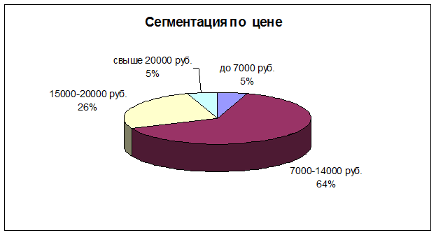 Рисунок 2 - Доли рынка Результаты проведенного маркетингового исследования говорят о том, что лидером рынка входных дверей являются двери «Toodoors» (31,25 %). Второе место принадлежит дверям фирмы «Редут» (23,75 %), третье место – двери фирмы «Цитадель» (11,25 %), далее следуют: 4. «Градис Строй» – 10 % 5. «Булат» – 7,5 % 6. «Крепкий Орешек» – 6,25 % 7. «СПМ Строй» – 3,75 % 8. «Готика» – 2,5 % 9. «Банкур», «Металлика плюс», «Panorama» – 1,25 % Таким образом, можно сделать выводы: 1). Абсолютным лидером рынка входных дверей г. Череповца является фирма «Toodoors». 2). Серьезную конкуренцию «Toodoors» составляет ООО «Редут». Двери «Toodoors» существуют на рынке г. Череповца всего около двух лет. Лидерство «Toodoors» можно объяснить широкомасштабной рекламой в нашем городе: рекламные ролики на телевидении, реклама в печатных изданиях, на транспорте, спонсорская поддержка различных мероприятий, но не следует также забывать и о низких ценах. О фирме «Редут» можно найти информацию лишь в периодической печати с рекламными объявлениями и в последнее время иногда на телевидении. Несмотря на это «Редут» занимает лидирующие позиции по степени известности, поскольку существует на рынке около 15 лет, что значительно дольше всех остальных конкурирующих фирм. 3). Свое предпочтение потребители отдают входной двери, отделанной ламинатом, кроме того, череповчане заинтересованы в индивидуальной комплектации входной двери, и в большинстве готовы потратить на неё до 14 тысяч рублей. По всей вероятности, в ближайшем будущем данный рынок будет расти, увеличатся предложения и ассортимент, а также спрос на входные двери. Для г. Череповца характерна такая тенденция, поскольку уровень доходов горожан растет, вследствие чего увеличивается и покупательная способность, то есть и спрос. 2.3.2. Емкость рынка входных дверей. Под емкостью рынка понимается возможный объем реализации продукции при определенных условиях соотношения спроса и предложения, с учетом изменения цен на товары одноименного назначения, за определенное время. Емкость рынка определим по результатам проведенного исследования Численность населения города Череповца составляет 308000 человек. За последние три года входную дверь поменяли 60 % респондентов. Значит, всего за последние три года 308000 * 60% = 184800 человек, т.е. примерно 61600 человек в год. Следовательно, в количественном выражении емкость рынка составляет примерно 61600 дверей. Средняя цена входной двери – 12 тысяч рублей. Таким образом, ёмкость рынка входных дверей в денежном выражении за последний год составляет примерно 12 000 руб. * 61 600 = 739'200'000 руб., то есть 739 млн. 200 тысяч рублей. Сегментация — это процесс разделения потребителей по мотивам и однородным признакам приобретения товара. Основа сегмента рынка — это группы потребителей с определенными схожими признаками, позволяющими ориентировать производство на них с последующим удовлетворением их потребностей. Главной целью сегментации являются выявление у каждой группы потребителей однородных потребностей в товаре и организация в соответствии с этим товарной, ценовой и сбытовой деятельности для увеличения доли рынка, способствующей достижению основной цели предприятия — увеличению прибыли. В результате сегментирования достигается главный принцип маркетинга — ориентация на потребителя Для потребительских товаров важным признаком явл