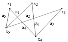 ![]() ![]() Например, если дорога имеет не двух-, а одностороннее движение то направление этого движения будет показано стрелкой. Если ребра не имеют ориентации, то граф называется неориентированным, (двухстороннее движение). В ориентированном графе дуга обозначается упорядоченной парой, состоящей из начальной и конечной вершин, ее направление предполагается заданным от первой вершины ко второй. Путем (или ориентированным маршрутом) ориентированного графа называется последовательность дуг, в которой конечная вершина всякой дуги, отличной от последней, является начальной вершиной следующей. Так, на рис. 2.1.2 путями являются последовательности дуг: а6 , а5 , а9 , а8 , а4 . (1) а1 , а6 , а5 , а9 . (2) а1 , а6 , а5 , а9 , а10 , а6 , а4 . (3) Ориентированной цепью (орцепью) называется такой путь, в котором каждая дуга используется не больше одного раза. Простой орцепью называется такой путь, в котором каждая вершина используется не более одного раза. Например, путь (2). Маршрут есть неориентированный “двойник” пути, и это понятие рассматривается в тех случаях, когда можно пренебречь направленностью дуг в графе. Таким образом, маршрут есть последовательность ребер ä1 , ä2 ,..., äq , в которой каждое ребро аi , за исключением первого и последнего ребер, связано с ребрами аi-1 и аi+1 своими концевыми вершинами. Последовательности дуг: ä2 , ä4 , ä8 , ä10 , (4) ä2 , ä7 , ä8 , ä4 , ä3 , (5) ä10 , ä7 , ä4 , ä8 , ä7 , ä2 . (6) в графе, изображенном на рис. 2.1.2, являются маршрутами; две точки над символом дуги означают, что ее ориентацией пренебрегают, т.е. дуга рассматривается как неориентированное ребро. Также путь или маршрут можно изображать последовательностью вершин. Например, путь (1) будет выглядеть следующем образом: х2 , х5 , х4 , х3 , х5 , х6 . Иногда дугам графа приписываются числа, называемыевесом, стоимостью, или длиной этой дуги. В этом случае граф называется графом с взвешенными дугами. А если вес приписывается вершинам графа, то тогда получается граф с взвешенными вершинами. Если в графе веса приписаны и дугам и вершинам, то он называется просто взвешенным. При рассмотрении пути µ представленного последовательностью дуг (ä1 , ä2 ,..., äq ), за его вес принимается число l(µ), равное сумме весов всех дуг, входящих в µ, т.е.