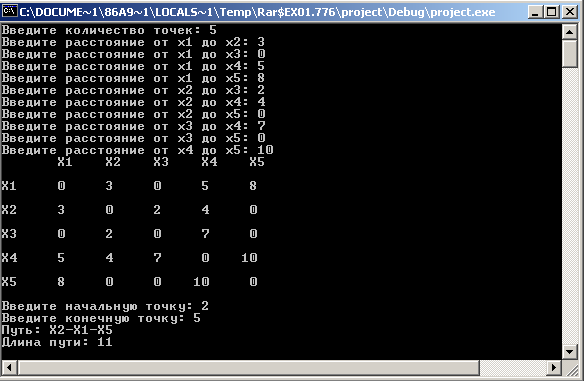 Рис. 4.1.1 Программа выводит минимальный путь между двумя указанными вершинами в графе и его длину. При запуске программы на экран выводится запрос о вводе весов рёбер исследуемого графа. Данные, введённые пользователем, отображаются в виде матрицы смежности, в которой не существующие рёбра обозначаются нулями. После указанным рёбрам присваивается значение 65535, которое принимается за бесконечность. Следующим этапом выполнения программы является запрос о вводе номеров вершин, между которыми необходимо узнать путь. В случае, если начальная и конечная вершины совпадают, отображается соответствующее сообщение и работа программы завершается. В противном случае выполняется непосредственно алгоритм Дейкстры, схема которого приведена в приложении В. Результатом программы является вывод на экран вершин, через которые проходит минимальный путь, а также вывод длины маршрута. Если пути между заданными точками не существует – выводится соответствующее сообщение. 4.2 Описание использованных программных средств Таблица 4.2.1–Описание переменных