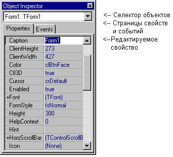 Рис.3. Инспектор объектов Свойства компонентов Свойства являются атрибутами компонента, определяющими его внешний вид и поведение. Многие свойства компонента в колонке свойств имеют значение, устанав иваемое по умолчанию (например, высота кнопок). Свойства компонента отображаются а странице свойств (Properties). Инспектор объектов отображает опубликованные (published) свойства компонентов. Помимо published-свойств, компоненты могут и чаще всего имеют общие (public), опубликованные свойства, которые доступны только во время выполнения приложения. Инспектор объектов используется для установки свойств во время проектирования. Список свойств располагается на странице свойств инспектора объектов. Можно определить свойства во время проектирования или написать код для видоизменения свойств компонента во время выполнения приложения. При определении свойств компонента во время проектирования нужно выбрать компонент на форме, открыть страницу свойств в инспекторе объектов, выбрать определяемое свойство и изменить его с помощью редактора свойств (это может быть п остое поле для ввода текста или числа, выпадающий список, раскрывающийся список, диалоговая панель и т.д.). События Страница событий (Events) инспектора объектов показывает список событий, распознаваемых компонентом (программирование для операционных систем с графическим пользовательским интерфейсом, в частности, для Windows 95 или Windows NT пре полагает описание реакции приложения на те или иные события, а сама операционная система занимается постоянным опросом компьютера с целью выявления наступления какого-либо события). Каждый компонент имеет свой собственный набор обработчиков событий. В C++ Builder следует писать функции, называемые обработчиками событий, и связывать события с этими функциями. Создавая обработчик того или и ого события, вы поручаете программе выполнить написанную функцию, если это событие произойдет. Длятого, чтобы добавить обработчик событий, нужно выбрать на форме с помощью мыши компонент, которому необходим обработчик событий, затем открыть страницу событий инспектора объектов и дважды щелкнуть левой клавишей мыши на колонке з ачений рядом с событием, чтобы заставить C++ Builder сгенерировать прототип обработчика событий и показать его в редакторе кода. При этом автоматически генерируется текст пустой функции, и редактор открывается в том месте, где следует вводить код. Курсор позиционируется внутри операторных скобок { ... }. Далее нужно ввести код, который должен выполняться при наступлении события. Обработчик событий может иметь параметры, которые указываются после имени функции в круглых скобках.