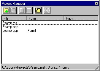 Рис.5. Менеджер проектов По умолчанию проект первоначально содержит файлы для одной формы и исходного кода одного модуля. Однако большинство проектов содержат несколько форм и модулей. Чтобы добавить модуль или форму к проекту, нужно щелкнуть правой кнопкой мыши и выбрать пункт New Form из контекстного меню. Можно также добавлять существующие формы и модули к проекту, используя кнопку Add контекстного меню менеджера проектов и выбирая модуль или форму, которую нужно добавить. Формы и модули можно удалить в любой момент в течение разработки проекта. Однако, из-за того, что форма связаны всегда с модулем, нельзя удалить одно без удаления другого, за исключением случая, когда модуль не имеет связи с формой. Удалить модуль из проекта можно, используя кнопку Remove менеджера проектов. Если выбрать кнопку Options в менеджере проектов, откроется диалоговая панель опций проекта, в которой можно выбрать главную форму приложения, определить, какие формы будут создаваться динамически, каковы параметры компиляции модулей (в том числе созданных в Delphi 2.0, так как C++ Builder может включать их в проекты) и компоновки.