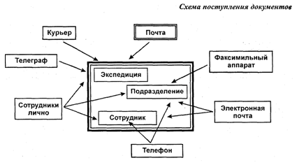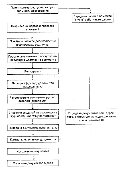 В документообороте, или порядке движения документов в организации, выделяется несколько этапов: 1. экспедиционная обработка документов, поступающих в организацию, и фиксация самого факта их поступления; 2. предварительное рассмотрение документов службой ДОУ; 3. организация движения документов внутри организации, включая доведение документов до исполнителей и придание юридической силы проектам документов; 4. обработка исполненных и отправляемых документов. Целесообразно установить единый порядок, согласно которому все документы, в том числе и полученные сотрудниками не по почте, обязательно проходили бы экспедиционную обработку, т.е. независимо от адресата корреспонденция должна передаваться должностным лицам для внесения в регистрационные базы данных, чтобы зафиксировать сам факт (и время) поступления документов. Блок-схема работы с входящими документами.