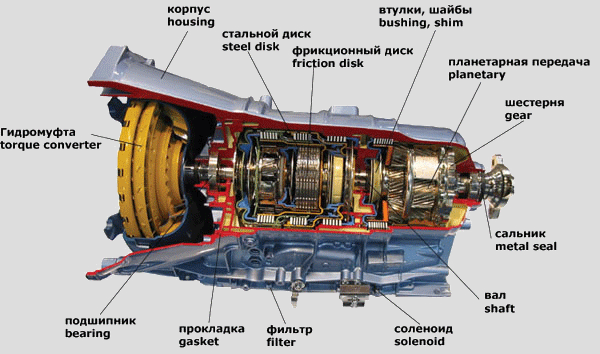 Автоматическая коробка передач. Улучшение эксплуатационных качеств современного автомобиля привело к значительному усложнению его конструкции. А оснащение автомобилей автоматической трансмиссией позволило резко снизить объем нагрузки, возлагаемой на водителя во время движения, что также благоприятно отразилось на ходовой части, двигателе и скоростных качествах автомобиля. Надежность и простота эксплуатации определили дальнейшее широкое использование этого изобретения. В настоящее время автоматические трансмиссии применяются и на легковых, и на полноприводных автомобилях, и даже на грузовом транспорте. При использовании транспортного средства с ручным управлением, для поддержания необходимой скорости, водителю необходимо часто пользоваться рычагом переключения передач. По этой причине он обязан постоянно следить за нагрузкой двигателя и скоростью автомобиля. Применение автоматической трансмиссии исключает необходимость постоянного пользования переключающим рычагом. Изменение скорости выполняется автоматически, в зависимости от нагрузки двигателя, скорости перемещения транспортного средства и желаний водителя. Поэтому, по сравнению с ручной коробкой передач, автоматическая трансмиссия имеет следующие неоспоримые преимущества: