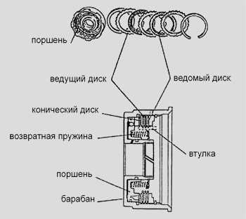 Планетарный ряд. Составные части фрикциона . Поршень (piston) приводится в действие давлением масла. Двигаясь под давлением масла вправо (по рисунку), поршень посредством конического диска (dished plate) плотно прижимает ведущие диски пакета к ведомым, заставляя их вращаться как единое целое и осуществляя передачу крутящего момента от барабана к втулке. В корпусе самой коробки передач расположены несколько планетарных механизмов, они и обеспечивают необходимые передаточные отношения. А передача крутящего момента от двигателя через планетарные механизмы к колесам происходит с помощью фрикционных дисков, дифференциала и других сервисных устройств. Управление всеми этими устройствами осуществляется благодаря трансмиссионной жидкости через систему управления и контроля.