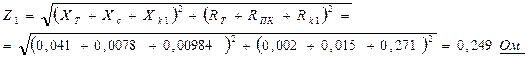 где Xc – приведенное индуктивное сопротивление энергосистемы (находим из заданного соотношения Хс/Хт), Ом, Rпк – переходное сопротивление контактов в местах соединения (принимаем равным 15мОм). Активным сопротивлением системы пренебрегаем.