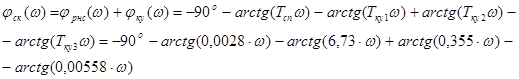 где Тку1 =1/wж1 =1/0,148=6,73 с, Тку2 =1/wж2 =1/2,82=0,355 с Тку3 =1/wку3 =1/180=0,00558 с Тку4 =1/wрн2 =1/357=0,0028 с Фазочастотная характеристика желаемой системы имеет вид