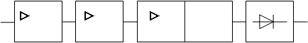 Рисунок 2.4 2.7 Выбор и обоснование выбора структурной схемы УЗЧ В качестве схемы выходного каскада тракта звуковой частоты выбирают двухтактную схему в режиме В или АВ на мощных транзисторах, так как Pвых > 0,2 Вт. Транзисторы выходного каскада выбирают исходя из условия допустимой мощности рассеивания на коллекторе (Pк max > Pк). Pк рассчитывают по формуле(2.19) 0,6*Р’ вых Рк = hтр * x?’ (2.19) где hтр - коэффициент полезного действия выходного трансформатора; x - коэффициент использования коллекторного напряжения; P’вых = Рвых/2 - выходная мощность, приходящаяся на один транзистор при двухтактной схеме. Исходя из моих исходных данных рассчитываем P’вых. P’вых = 1/2 = 0,5 Вт Выбираем hтр исходя из предела 0,7-0,8, в данном случае hтр = 0,7. Выбираем x из предела 0,8-0,95, в данном случае x = 0,8. 0,6*0,5 Рк = 0,7*(0,8)? = 0,67 Вт Исходя из полученных данных в формуле (2.19), выбираем транзистор П 201. Следующим этапом является определение коэффициента усиления по мощности тракта звуковой частоты, который рассчитывается по формуле (2.20) P ’ вых Кр нч = Рвх ’ (2.20) где Рвх - мощность сигнала звуковой частоты на входе первого каскада тракта звуковой частоты, Вт. Из рассчитанных в данной главе данных, можем определить Кр нч. -6 Кр нч = 0,5/10 = 500000 Учитывая, что коэффициент усиления по мощности выходного каскада (Кр вых) находится в пределах 30-100, рассчитывают коэффициент усиления по мощности предварительных каскадов (Кр пред) рассчитывают по формуле (2.21) К р нч Кр пред = Кр вых (2.21) 5 Из формулы (2.20) Кр нч = 5*10 , а Кр вых выбирают из предела 30-100, я выбираю Кр вых = 50. 5 5*10 Кр пред = 50= 10000 Полученное значение Кр пред позволяет ориентировочно определить число каскадов предварительного усиления, пологая, что один каскад, выполненный по схеме с общим эмиттером, обеспечивает коэффициент усиления мощности не менее 30-100. Исходя из формулы (2.21), выбираем три каскада усиления с коэффициентом усиления каждого каскада 50, следовательно общий коэффициент усиления будет равен 125000. Так как общий коэффициент усиления по мощности больше чем рассчитанный, то при ведении отрицательной обратной связи, коэффициент усиления уменьшается, но не станет меньше рассчитанного и поэтому добавочные каскады не требуются. Исходя из полученных в главах 2.3, 2.4, 2.5, 2.6, 2.7, данных составляем структурную схему радиоприемника, которая изображена на рисунке 2.5.