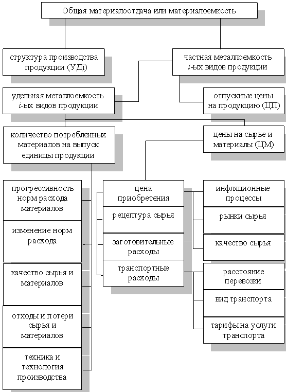 Это один из основных факторов, влияющих на материалоемкость (общую, частную, удельную). Поэтому необходимо остановиться на оценке состояния нормирования сырья и материалов. В связи с этим выше были введены в рассмотрение такие показатели (коэффициенты), как сырьеемкость продукции (СМЕ), металлоемкость продукции (ММЕ), топливоемкость продукции (ТМЕ), энергоемкость продукции (ЭМЕ). Влияние факторов первого порядка на материалоотдачу или материалоемкость можно определить способом цепной подстановки: