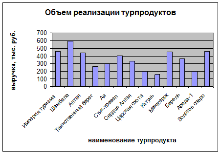 Объем реализации турпродуктов можно представить также на рис. 2. Рисунок 2 – Объем реализации турпродуктов Таким образом, из рис. 2 видно, что наиболее продаваемыми турпродуктами ООО «Сибирь-Алтай» за рассматриваемый период являлись отдых на базах «Шамбала», «Империя туризма», «Манжерок», «Золотое озеро», «Алтан». К наименее продаваемым турпродуктам рассматриваемого периода можно отнести отдых на базах: Катунь», «Царская охота». 2.3 Анализ факторов, влияющих на объем, структуру услугАнализируя факторы, влияющие на объем и структуру услуг турпродукта, можно отметить следующее. Прежде всего, нужно отметить, что продукция ООО «Сибирь-Алтай» имеет сезонный характер спроса. Предприятие не предлагает активный зимний отдых, поэтому наибольший спрос на турпродукты наблюдается в летний период времени. Наиболее продаваемым турпродуктом является отдых на базе «Шамбала», имеющий стоимость проживания от 170 до 400 руб. на взрослого человека в сутки, включающий проживание в благоустроенных коттеджах и летних домиках, разнообразные экскурсии, прокат турснаряжения и спортинвентаря. Количество дней отдыха – 2 (маршрут выходного дня), 5,7,9 или 12. Отдых включает разнообразные удобства (автостоянка, бассейн), для любителей активного отдыха предлагается прокат лошадей, сплавы по реке Катунь. Турпродукт рассчитан на потребителя среднего класса, предпочитающего уютную семейную атмосферу. Туристская база «Шамбала» расположилась по соседству с турбазой «Империя туризма». В 500 метрах от нее несет свои воды красавица-Катунь, в 400 метрах, среди живописных гор, притаилось теплое озеро Ая. За четыре года работы база уже успела завоевать устойчивую репутацию среди отдыхающих. Особенно хороша она для семейного отдыха с детьми: в уютной обстановке здесь можно уединиться после шумных развлекательных мероприятий, которые предлагаются на соседних базах. Также продаваемыми являются турпродукты «Империя туризма», «Манжерок», «Золотое озеро». Стоимость проживания в первом варианте составляет 300–840 руб. в сутки на взрослого человека. Туристу предлагается проживание в благоустроенных комфортабельных деревянных коттеджах и в летних домиках с удобствами на территории. Предлагаются разнообразные экскурсии, прокат спортинвентаря. Стоимость путевки на базу «Манжерок» составляет 5100–5750 руб. Проживание в благоустроенных коттеджах в 2–3–4-местных комнатах. На территории: столовая, бар, торговый киоск, баня, волейбольная площадка, пляж, автостоянка. Предлагаются услуги массажиста. Туристский комплекс «Манжерок» находится в сосновом лесу, на берегу живописной реки Катунь. Пятнадцать лет встречает он своих туристов и полюбился многим сложившимися традициями. Одновременно комплекс может принять до 80 человек помимо размещения в стационарном палаточном лагере. Уютно себя здесь чувствует любой, а для семейного отдыха – это самый выгодный вариант, особенно для тех, кто никогда не был на Алтае, и желает как можно больше о нем узнать, т.к. расположение комплекса очень удобно по отношению ко многим экскурсионным объектам и посещение их уже включено в стоимость путевки. Стоимость проживания в варианте «Золотое озеро» составляет 240–800 руб. в сутки на взрослого человека. Здесь туристу предлагается проживание в благоустроенном корпусе (номера со всеми удобствами), летн