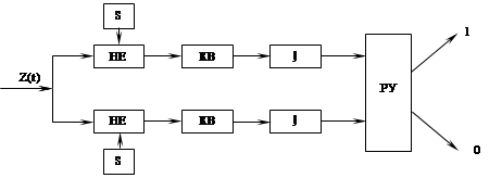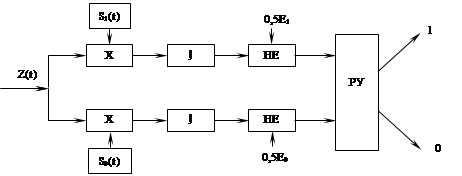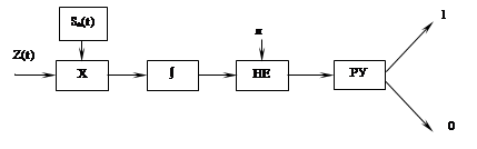 Рисунок 1. - Структурная схема системы связи. 2. Выбор схемы приемникаСигнал на входе приемника представляет собой сложное колебание, в котором для передачи информации используется изменение значения частоты сигнала. При некогерентной обработке высокочастотных сигналов (обработке по огибающей) снижаются требования к точности установления границ посылок элементарных канальных сигналов длительностью Т. Все же для реализации оптимальной схемы средняя частота заполнения сигналов должна быть известна с высокой точностью. При приеме сигналов двоичной ЧМ распространена схема, изображенная на рисунке 2.1. S1 (t)=A cos w1 t и S0 (t)= A cos w0 t Правило решения для такого приемника S1 (t) - S0 (t)>0 то S1