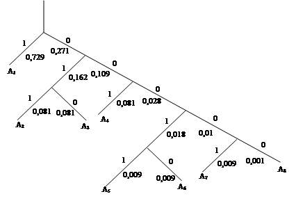 Из точки с вероятностью "1" направляем две ветви. Ветви с большей вероятностью приписываем 1 и откладываем влево, а ветви с меньшей вероятностью приписываем 0 и откладываем вправо. Такое последовательное ветвление продолжим до тех пор, пока не дойдем до вероятности каждой отдельной буквы. Кодовое дерево изображено на рисунке 6.1. Теперь двигаясь по кодовому дереву с верху вниз можно для каждой буквы записать новую кодовую комбинацию.