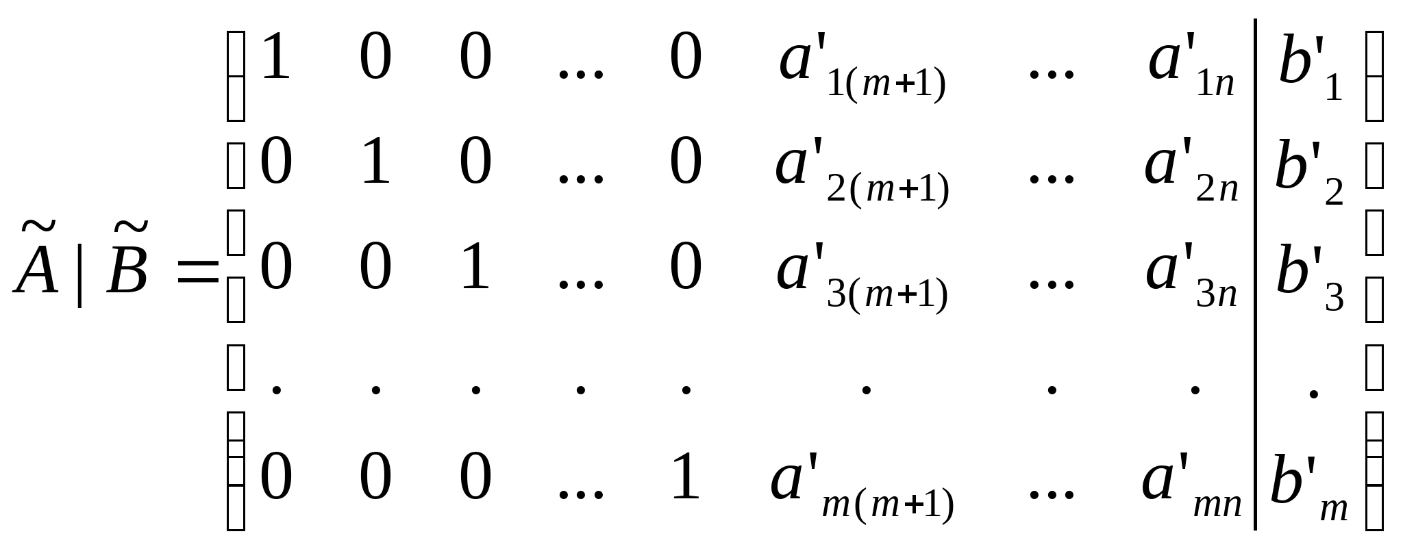 A – основная матрица системы (или матрица коэффициентов при неизвестных) X – вектор-столбец решений системы (вектор неизвестных) B – вектор свободных коэффициентов Решением системы такого вида называется всякий n – компонентный вектор-столбец X, обращающий матричное уравнение в тождество (равенство). Найдём решение с помощью метода последовательных исключений Жордана-Гаусса, который заключается в последовательном исключении неизвестных. Дополнительно выделим из множества решений вектор-решения минимальный по Евклидовой норме. В MatLab стандартная функция rref(A), …/matlab/toolbox/matlab/matfun/rref.m, приводит матрицу A к треугольному виду на основе классического метода исключения Гаусса с частичным выбором ведущего элемента. В данной функции реализуется следующий код: который, не меняя местами столбцы матрицы системы, приводит матрицу к диагональному виду, работая только со строками(таким образом, использование этой функции не приведетк ошибкам). % Loop over the entire matrix. % Перебор каждого элемента матрицы i = 1; j = 1; jb = []; while (i <= m) & (j <= n) % Find value and index of largest element in the remainder of column j. % Найти значение и индекс самого большого элемента в остатке от колонки j. [p,k] = max(abs(A(i:m,j))); k = k+i-1; if (p <= tol) % The column is negligible, zero it out. % Если остаток колонки незначителен, то обнуление остатка и переход на следующую иттерацию. A(i:m,j) = zeros(m-i+1,1); j = j + 1; else % Remember column index % Запоминание индекса колонки jb = [jb j]; % Swap i-th and k-th rows. % Поменияем месками i-ую и j-ую строки. A([i k],j:n) = A([k i],j:n); % Divide the pivot row by the pivot element. % Деление элементов текущей строки на текущий элемент A(i,j:n) = A(i,j:n)/A(i,j); % Subtract multiples of the pivot row from all the other rows. % Вычесть элементы текущей строки из всех других строк, начиная с j-го элемента. for k = [1:i-1 i+1:m] A(k,j:n) = A(k,j:n) - A(k,j)*A(i,j:n); end i = i + 1; j = j + 1; end end Для этого, с помощью элементарных преобразований над строками и перестановки столбцов расширенную матрицу системы A|B (матрица, образованная добавлением столбца свободных коэффициентов B к основной матрице системы A) приведём к виду: