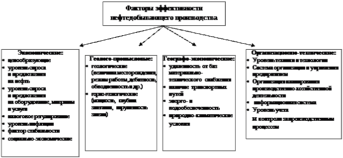 Рис. 2. Классификация основных факторов, влияющих на эффективность нефтедобывающего производства Современный этап развития нефтедобывающей отрасли характеризуется тем, что во многом исчерпаны возможности реализации экстенсивных факторов роста, значительная часть месторождений находится в поздней стадии разработки, характеризующейся рядом особенностей: · месторождения расположены в промышленно развитом регионе с развитой инфраструктурой; · сырьевая база формируется остаточными и трудноизвлекаемыми нефтяными ресурсами; · большая часть инвестиций для полного освоения нефтяных ресурсов направлена в пробуренные скважины и объекты обустройства месторождений. ЗАКЛЮЧЕНИЕ Экономический рост и благосостояние нашей страны в значительной мере зависят от уровня развития нефтедобывающей промышленности. Проблемы развития процессов, влияющих на эффективность деятельности нефтедобывающих предприятий, являются наиболее актуальными для стабилизации экономики Российской Федерации. Изношенность основных фондов, уменьшение фонда эксплуатационных скважин, падение их дебита, недоинвестирование – основные характеристики нефтедобывающей отрасли в настоящее время. Очевидно, при эксплуатации истощенных нефтяных месторождений проблема повышения эффективности нефтедобычи приобретает особенно большое экономическое значение. Для предприятий, характеризующихся снижением производительности основных фондов, наиболее приемлемым является направление, способствующее повышению эффективности нефтедобывающего производства. Оно предусматривает увеличение ресурсного, производственного и экономического потенциала и определяется совершенствованием механизмов реализации организационных и экономических резервов повышения эффективности нефтедобычи. Для решения этих проблем необходимо создать определенные организационные и экономические условия, что позволит продлить экономически оправданный срок разработки и эксплуатации таких месторождений. Нефтедобыча в стране за последние 5 лет в 2 раза превысила прирост новых запасов, что может привести к скорому исчерпанию нефтяных ресурсов. В период 2000-2006 гг. доля Российской Федерации в мировых доказанных запасах нефти возросла на 1,2%, объем доказанных запасов – на 23,7%, или на 1575 млн. т. [18] В промышленной разработке находится около 1100 нефтяных месторождений, на которых пробурено более 150 тыс. скважин.[19]. Для успешного развития нефтедобывающей отрасли необходимы инвестиции порядка 10 млрд. долл. ежегодно. [11] В связи с этим, становится целесообразным реформирование законодательной базы о недрах, активизация инновационно инвестиционной деятельности нефтедобывающих предприятий, а также промышленное освоение истощенных нефтяных месторождений малыми предприятиями, обеспечивающими 10% нефтедобычи в стране и способными довести нефтедобычу до 60 млн. т к 2010 году, что имеет определенные перспективы в цели повышения эффективности нефтедобывающего производства. [28] Большое значение приобретает решение эколого-экономических проблем, что связано с высокой техногенной нагрузкой нефтедобывающего производства. В законодательных и нормативных актах, регулирующих добычу нефти, производственный процесс рассматривается независимо от стадии эксплуатации нефтяного месторождения. Поздняя 