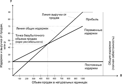 Для определения точки безубыточного объёма продаж или порога рентабельности используются графический и аналитический (расчётный) способы. График (рис. 1.) даёт наглядное представление о взаимосвязи между объёмом продаж, издержками и прибылью. Для его построения использована следующая информация. Предприятие производит продукцию одного наименования. Производственная мощность предприятия рассчитана на 1000 изделий, которые продаются по цене 90 тыс. р. Она в течение отчётного периода (например, месяца) не изменялась. Всё, что производится – реализуется, незавершённого производства и остатков готовой продукции на складах нет. Следовательно, объём производства продукции равен объёму продаж (выручке), т.е. 90 млн.р. Переменные издержки на одно изделие – 50 тыс.р., а на весь запланированный выпуск продукции – 50 млн.р. Постоянные издержки на весь выпуск – 20 млн.р., полные издержки – 70 млн. р., прибыль от реализации продукции 20 млн.р. (90-70).