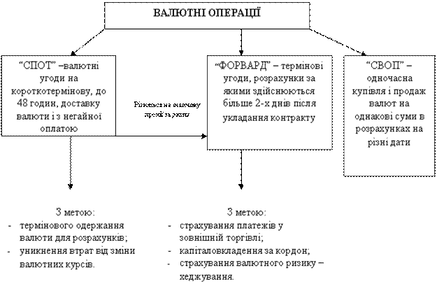 2. Структура валютного ринку Валютний ринок має свою структуру. Він включає національні ринки, міжнародні ринки і світовий ринок. Структура валютного ринку : За суб’єктами: - Міжбанківський (прямий і брокерський) (біля 80% обсягу всіх операцій на світовому валютному ринку припадає на міжбанківський ринок, оскільки валютні біржі існують не в усіх країнах світу) - Клієнтський - Біржовий - Торгівля через валютну біржу - Торгівля деривативами За терміном операцій: - СПОТ ринок (поточний) - Форвардний ринок (терміновий) - СВОП ринок За функціями: - Обслуговування міжнародної торгівлі - Чисто фінансові трансферти (спекуляція, хеджування, інвестиції) За валютними обмеженнями: - Вільні - Обмежені За застосуванням валютних курсів: - З одним режимом - З кількома режимами За об’ємом і характером валютних операцій: - Глобальні (світові) - Регіональні (міжнародні) - Внутрішні (національні) За територіальною ознакою: - Європейський ринок – Лондон, Франкфурт-на-Майні, Париж, Цюрих. - Американський ринок – Нью-Йорк, Чикаго, Лос-Анджелес, Монреаль. - Азіатський – Токіо, Гонконг, Сингапур, Бахрейн. Національні валютні ринки функціонують у більшості країн світу. Вони обмежуються економічним простором конкретної країни і регулюються її національним валютним законодавством. Міжнародні валютні ринки сформувалися в тих країнах, в яких до мінімуму зведені обмеження на валютні операції. Такі ринки в основному регулюються міждержавними угодами, традиціями та домовленістю учасників цих ринків. Світовий валютний ринок поєднує окремі міжнародні ринки і працює практично цілодобово. З початку доби відкриваються азіатські ринки (в містах Токіо, Гонконг, Сінгапур тощо), а після їх закриття працюють європейські ринки (в містах Париж, Лондон тощо), а під кінець дня — ринки американського континенту. Завдяки цьому будь-який суб’єкт валютного ринку може будь-коли, зв’язавшись з центром, здійснити операції з купівлі-продажу валюти. За характером операцій валютний ринок поділяється на ринок конверсійних операцій (перетворення або заміна на еквівалентній основі рівновеликих цінностей шляхом їх обміну) та ринок депозитно-кредитних операцій, на якому купівля валюти здійснюється шляхом її залучення на депозитні вклади на узгоджені строки та наступний продаж у формі надання кредитів на різні строки. За територіями розміщення світові валютні ринки поділяються на європейські, азіатські, північноамериканські тощо. За характером оплати валютний ринок поділяється на ринок безготівкових валютних операцій і ринок готівкових валютних операцій. 3. Валютний ринок України Операції з іноземною валютою на території України здійснюються відповідно до чинного законодавства. До валютних операцій належать: - операції з використанням валютних цінностей у мінімальному обігу як засобів платежу; - операції, пов’язані з переказом і пересиланням за її межі валютних цінностей. Валютними цінностями на території України вважаються: валюта України, платіжні документи й інші папери, іноземна валюта, платіжні документи й інші папери виражені в іноземній валюті, монетарні метали, метали платинових груп. Валютний ринок не може бути статичним – це суперечить його природі. На ньому постійно коливаються курси залежно від ситуації. Важливими елементами зовнішньоекономічного механізму в умо