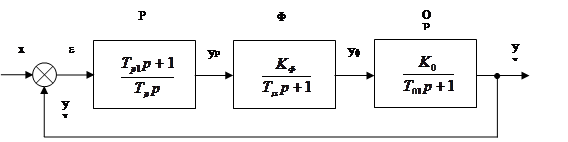 4.2.3 Система с минимальным показателем колебательности 4.2.4 Расчет и построение ЛАЧХ и ЛФЧХ разомкнутых САР 4.2.5 Связи между прямыми показателями качества и частотными характеристиками 4.3 Произвести аналитический расчет переходных процессов САР 4.3.1 Расчет переходных процессов 4.3.2 Построение переходных процессов 4.4 Экспериментальный расчет переходных процессов 4.5 Определение показателей САР 1. Задание на курсовую работуЗадан объект регулирования, состоящий из двух звеньев, и звено фильтра. Первое звено объекта регулирования - апериодическое звено первого порядка с постоянной времени Т01 =0,24с и коэффициентом усиления К0 =3. Второе звено объекта регулирования - интегрирующее с постоянной времени Т02 =0,4 с. Фильтр представляет собой апериодическое звено первого порядка с коэффициентом усиления КФ =8 и постоянной времени Тμ =0,04 с. Постоянная времени Тμ является наименьшей некомпенсируемой постоянной времени системы. Структурная схема объекта регулирования представлена на рисунке 1. Структурная схема объекта регулирования