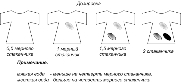 Советы хозяйкам по правильной дозировке стиральных порошков.Рекомендуемая доза для для хороших порошков соответствует половине стеклянного стакана 250 мл. из расчета на 10 литров воды. Если ваша стиральная машина вмещает более 30 литров воды, мы рекомендуем использовать полный стеклянный стакан 250 мл. Пластиковые и картонные стаканчики обычно имеют меньший объем - 200 мл. Рекомендуемая доза для стирки в автоматических стиральных машинах соответствует наполненному с "верхом" стеклянному стакану 250 мл (одна полная загрузка автоматической стиральной машины). Если вы пользуетесь мерным стаканчиком, смотрите информацию ниже. Дозировка порошка зависит от жесткости воды, степени загрязненности и количества белья для стирки.