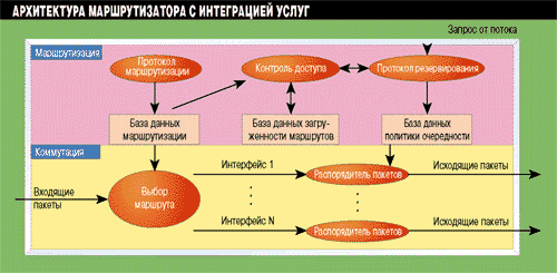 Информация о маршрутизации содержит метрику , т. е. меру времени или расстояния, и несколько отметок о времени. Информация о пересылке включает в себя данные о выходном интерфейсе и адрес следующей системы по пути. Обычно маршрутизаторы хранят данные о нескольких возможных следующих транзитных маршрутизаторах в одной строке таблицы. Качество услуг (QoS) - это ключевая фраза для обозначения сетей передачи данных без потери ячеек с предсказуемой задержкой из конца в конец и доставкой в реальном времени после установления соединения. Высококачественное мультимедиа в сети как в реальном времени, так и при воспроизведении аудио- и видеофайлов с сервера предполагает наличие сети с обеспечением качества услуг. Маршрутизатор с интеграцией услуг. Маршрутизатор с интеграцией услуг должен поддерживать протокол резервирования ресурсов (Resource Reservation Protocol, RSVP). Маршрутизаторы этого типа добавляют протокол ресурсов, контрольный модуль и интерфейс к политике очередей уровня коммутации.