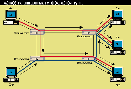 Спецификация фильтра позволяет отобрать пакеты для применения к ним спецификации потока. Прошедшим фильтр пакетам гарантируется качество услуг, остальные доставляются по мере возможности. Многоадресная группа: что делать с данными ? Основная сложность RSVP связана с многоадресной рассылкой. Пример многоадресной конфигурации приведен на рисунке. Эта конфигурация состоит из четырех маршрутизаторов. Канал между двумя любыми маршрутизаторами, изображаемый линией, может представлять собой как прямой канал, так и подсеть. Три хоста - G1, G2 и G3 - входят в одну группу и получают дейтаграммы с соответствующим групповым адресом. Данные по этому адресу передаются двумя хостами - S1 и S2. Красная линия соответствует дереву маршрутизации для S1 и данной группы, а синия линия для S2 и данной группы. Линии со стрелками указывают направление передачи пакетов от S1 (красная) и от S2 (синяя).