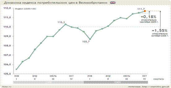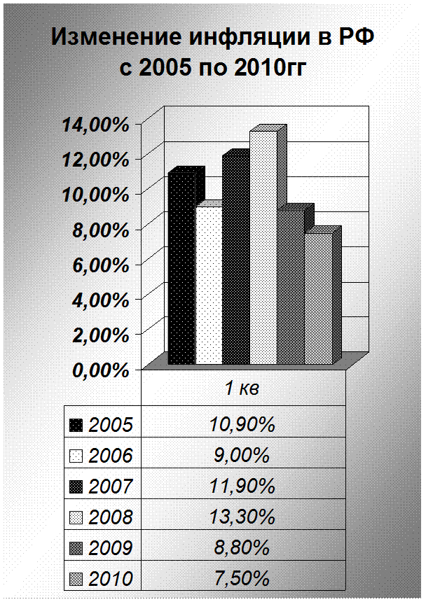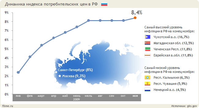 Источник: ИПЦ в Великобритании в 2008-2010 гг.//www.advis.ru Все приведенные выше примеры свидетельствуют об одном: борьба с инфляцией в разных странах, с разным развитием экономики и других экономических предпосылках должна осуществляться по-разному и применение ортодоксально- монетаристских методов бывает недостаточно . Успешными являются смешанные программы, в которых в том, или ином варианте сочетаются меры ортодоксально-монетаристского и гетеродоксального характера. Глава 3. Специфика инфляции в России 3.1. Инфляция 2009 -2010 года х Уровень инфляции в 2008г. составил в среднем 13,3 % . Это было в основном вызвано финансовым кризисом в мировой экономике в конце года, «застрельщиком» и основной жертвой которого стали США. По мнению Николаева И., директора департамента стратегического анализа ФБК, главной причиной мирового кризиса стала глобальная перекапитализация фондовых рынков как развитых, так и развивающихся стран. При этом наблюдается глобальное отсутствие доверия между контрагентами и широкое распространение принципа накопления запасов наличности, о чем свидетельствуют и эксперты МВФ. Если в 2008г. рост инфляции эксперты объясняли в основном увеличением тарифов на услуги, то теперь виновны и потребительские цены. Например, сахарный песок подорожал на 6,5%, а чай - на 1,2%. Сильно выросли цены на молочные сухие смеси для детского питания, замороженную рыбу, мясные консервы, рис и соль. Да и плодоовощная продукция подорожала на 1,3%. Но и тарифы по традиции в январе 2009г. поднялись. За отопление россиянам приходится платить почти на 14% больше, за электричество - больше на 21%. Плата за холодную воду подскочила на 14,5% , а за горячую - на 19%. Ситуация в сфере экономики остается напряженной. Официальная статистика фиксирует снижение производства практически по всем секторам экономики: от 15 до 80% по отдельным позициям. Происходит перераспределение валютных резервов государства и средств бюджета в валютные активы банков, компаний и населения. Много денег, переданных банкам для реального сектора, ушло в валюту. В свою очередь и население львиную часть своих сбережений постаралось превратить в доллары и евро. Инвестиции в иностранные активы выросли с начала сентября кратно. Внутренний денежный спрос замер. К декабрю 2008г. денежная масса М2 упала на 9% в сравнении с началом осени. При этом ЦБ России упорно проводит денежную политику в оригинальном для мировой практики варианте. Вместо стимулирования внутреннего спроса продолжается ограничение денег в обращении и запредельный рост их стоимости. Никакой эмиссии, никакого стимулирования национальной экономики с помощью целевого рефинансирования коммерческих банков под портфели кредитов предприятиям. Трудно удерживать финансовый сектор на фоне глубокого падения объемов производства, да еще при такой тяге к валюте вместо кредитов бизнесу со всеми их рисками. Важно не допустить физического сокращения банковских ссуд экономике и их концентрации только в крупнейших компаниях. Велика угроза переноса кризиса из экспортных отраслей и строительства на транспорт, обработку, производство потребительских товаров. Экспортная экономика 2000–2008гг. основанная на мыльном пузыре мировых цен на сырье, закончилась. Низкие экспортные цены, которые могут продержаться не год и не два. Они выживают только за счет ро