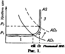 Увеличение денежной массы по указанным выше причинам в течение короткого промежутка времени сдвигает кривую совокупного спроса вправо (ADi -> AD2), и если экономика находится на промежуточном (2) или классическом (3) отрезках кривой совокупного предложения, то это ведет к росту цен, что представляет инфляцию спроса.Инфляция издержек(cost—pushinflation) означает рост цен вследствие увеличения издержек производства. Причинами увеличения издержек могут быть олигополистическая практика