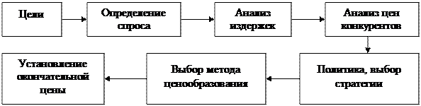 Рисунок 1 – Процесс ценообразования. Составлено автором по[2, 4, 15] Рассмотрим подробнее каждый этап. 1.Постановка целей ценообразования . Прежде всего фирме предстоит решить, каких именно целей она стремится достичь с помощью конкретного товара. Если выбор целевого рынка и рыночное позиционирование тщательно продуманы, тогда подход к формированию комплекса маркетинга, включая и проблему цены, довольно ясен. Чем яснее представление фирмы о целях ценообразования, тем легче установить цену. Примерами таких целей могут быть: -рост. Если компания стремится к тому, чтобы ее товар, обладающий отличительным преимуществом, занял место на привлекательном рынке, она использует цены как основное оружие в завоевании рыночного «плацдарма» или его расширении. -обеспечение выживаемости, которое становится основной целью фирмы в тех случаях, когда на рынке слишком много производителей и царит острая конкуренция или резко меняются потребности клиентов. Чтобы обеспечить работу предприятий и сбыт своих товаров, фирмы вынуждены устанавливать низкие цены в надежде на благожелательную ответную реакцию потребителей. Выживание важнее прибыли. -максимизация текущей прибыли, для чего фирмы производят оценку спроса и издержек применительно к разным уровням цен и выбирают такую цену, которая обеспечит максимальное поступление текущей прибыли и наличности и максимальное возмещение затрат. -завоевание лидерства по показателям доли рынка. Вариантом этой цели является стремление добиться конкретного приращения доли рынка. Добиваясь лидерства по показателям доли рынка, фирмы идут на максимально возможное снижение цен. -завоевание лидерства по показателям качества товара, что обычно требует установления на товар высокой цены, чтобы покрыть издержки на достижение высокого качества и проведение дорогостоящих НИОКР. [2, 5, 9, 15] 2. Определение спроса. Любая цена, назначенная фирмой, так или иначе, скажется на уровне спроса на товар. Зависимость между ценой и сложившимся в результате этого уровнем спроса представлена кривой спроса, которая показывает, какое количество товара будет продано на рынке в течение конкретного отрезка времени по разным ценам, которые могут взиматься в рамках данного отрезка времени (рис. 2)