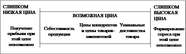 На рисунке 5 отражены проблемы, связанные с выбором стратегии ценообразования. Позиции, пересекаемые диагонально и находящиеся справа от нее представляют собой комбинации цен и качества, имеющие ценностную значимость для покупателя. Стратегии установления высоких цен имеют смысл лишь тогда, когда они разрабатываются для товаров высочайшего качества. Но и в этом случае остается опасность того, что конкуренты предложат потребителям большую ценность, т. е. товар аналогичного качества по относительно низкой цене. Точно так же экономические стратегии низких цен и низкого качества эффективны лишь до тех пор, пока конкуренты не предложат по тем же ценам товар более высокого качества. Любая позиция слева от диагонали представляет собой нереальную стратегию. [2] 6. Выбор метода ценообразования Зная график спроса, расчетную сумму издержек и цены конкурентов, фирма готова к выбору цены собственного товара. Цена эта будет в промежутке между слишком низкой и слишком высокой (рис. 6). Минимально возможная цена определяется себестоимостью продукции, максимальная – наличием каких-то уникальных достоинств в товаре фирмы. Цены товаров конкурентов и товаров-заменителей дают средний уровень, которого фирме и следует придерживаться при назначении цены.