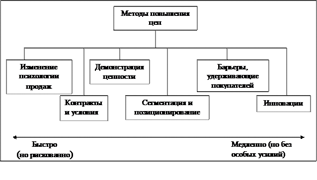 Сопоставление подходов ценовой политики свидетельствует о необходимости избавления от пассивных методов ценообразования, все большей его активизации в прогрессивном преобразовании экономики российских предприятий, устранении ее затратного характера. 7. Установление окончательной цены Самый последний шаг – установление окончательной цены. Выбрав один из методов ценообразования, необходимо принять само ценовое решение, определить конкретную цену. Здесь учитывается целый ряд аспектов, таких как психологическое воздействие, влияние разных элементов маркетинга, соблюдение базовых целей ценовой политики, анализ возможной реакции на принимаемую цену. Роль психологического воздействия определяется тем, что цена служит для многих потребителей главным показателем качества изделия. Цены, создающие имидж, характерны прежде всего для продукции, воздействующей на самосознание покупателя. Потребитель может предпочесть более дорогую вещь, если она представляется ему более оригинальной и престижной. Полученные в результате проекты цен целесообразно перепроверить с позиций достижения исходных целей ценовой политики. Следует оценить, какую реакцию рынка вызовет цена? Как воспримет эту цену торговля? Какой будет конечная розничная цена с учетом торговой надбавки? Как отреагируют на данную цену конкуренты? Не вступает ли эта цена в противоречие с действующим законодательством? Если полученные ответы удовлетворяют предпринимателя, то товар предлагается рынку, а в ценовой политике начинается период ценовых модификаций, дифференциации, скидок и других приспособлений к постоянному изменению текущих условий рыночной конъюнктуры. По мере развития рынка растущая конкуренция и чувствительность покупателей к ценам вынуждают компанию снизить реальные цены на товары. С другой стороны, инфляция, ожидание роста прибыли заинтересованными группами, трудности в разработке новых товаров – все это заставляет руководителей компаний искать новые пути повышения чистой прибыли. Один из самых эффективных способов – повышение цен на продукцию компанию. [2, 4] Стратегии повышения цен на товары: 1. Изменение психологии работников службы сбыта. Изменение психологии торговой команды компании предполагает проведение тренингов для торговых агентов и повышение их мотивации. Обычно продавцы озабочены прежде всего получением заказа и под давлением покупателей легко идут на снижение цен. Менеджмент компании должен быть ориентирован на изменение психологии торговых агентов, подвигая их к осознанному риску. Необходимо пересмотреть систему стимулов работников отдела сбыта, отказаться от премирования за объем продаж. Необходимо построить систему стимулирования, ориентированную на высокую валовую прибыль или конкретные цены. И наконец, «фронтовикам» современного рынка не обойтись без профессиональных навыков ведения переговоров. 2. Контакты и переговоры. При заключении долгосрочных договоров и соглашений, которые подразумевают существование значительного разрыва во времени между заказом и доставкой, опытные менеджеры часто оговаривают условие скользящих цен, позволяющих поставщику автоматически повышать их уровень в соответствии с темпами инфляции. Еще одна контрактная форма зашиты прибыли компании – следование формуле «издержки 