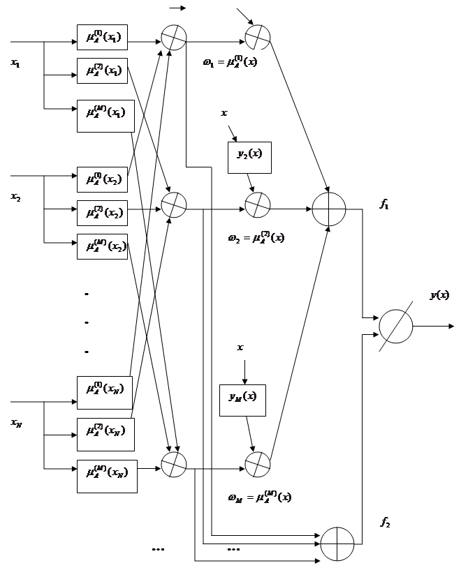где Нечеткая нейронная сеть TSK задается многослойной структурной сетью, представленной на рисунке 1. В такой сети выделяют 5 слоев. 1. Первый слой выполняет раздельную фаззификацию каждой переменной 2. Второй слой выполняет агрегирование отдельных переменных 3. Третий слой представляет собой генератор функции TSK, в котором рассчитывается значения 4. Четвертый слой составляют 2 нейрона-сумматора, один из которых рассчитывает взвешенную сумму сигналов 5. Пятый слой состоит из одного единственного нейрона. В нем веса подлежат нормализации и вычисляется выходной сигнал