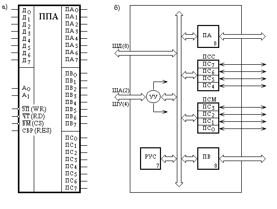 Здесь цифровой автомат выполнен в виде: двоичного регистра Рг последовательного приближения, суммирующего импульсы тактового генератора ТГ; выходных буферных устройств 1, 2, 4, ..., 256, соответствующих двоичным разрядам счётчика; схемы готовности данных ГД, управляющей счётчиком и выдающей команду на считывание выходного кода. Термостабилизированный источник опорного напряжения ИОН вырабатывает напряжение Uоп для ЦАПа. Компаратор выполнен синхронизируемыми импульсами тактового генератора. Поступающие на вход регистра импульсы тактового генератора последовательно переводят разряды регистра в состояние 1 начиная со старшего, при этом остальные разряды находятся в состоянии 0. Если старший разряд находится в состоянии 1, ЦАП вырабатывает соответствующее напряжение, которое сравнивается в компараторе со входным. Если Uцап>Uвх, то по команде компаратора старший разряд регистра сбрасывается в нуль, если Uцап<Uвх, то в старшем разряде остаётся единица. Затем единица появляется в следующем по старшинству разряде регистра и снова происходит сравнение. Цикл повторяется пока не произойдет сравнение в младшем разряде (рис. 8). ВОПРОС 29 Параллельный адаптер КР580ВВ55. Микросхема КР580ВВ55 программируемого периферийного параллельного адаптера (ППА) предназначена для применения в МП-системе в качестве универсального элемента ввода-вывода, обеспечивающего обмен данными в параллельном формате между МП и системными, в частности периферийными, устройствами. Аналогичное назначение, функции и структуру имеют микросхема К580ИК55 и зарубежный аналог ППА Intel 8255 [1, 2, 3]. Условное обозначение ППА и его программная модель показаны на рис. 1.Микросхема КР580ВВ55 размещена в 40-контактном корпусе и подключается к МП системе посредством двунаправленной трехстабильной 8-разрядной шины данных ШД(8), двухразрядной шины адреса ША(2) и 4-разрядной шины управления ШУ(4) с сигналами: ‑ запись, ‑ чтение, ‑ выборка микросхемы и СБР(RES) ‑ сброс. Адаптер включает три программно-доступных 8-разрядных порта ввода-вывода (ПА, ПВ, ПС) и 8-разрядный регистр управляющего слова РУС, содержимое которого определяет направление передачи и функционального назначение 24 двунаправленных трехстабильных линий ввода-вывода, т. е. конфигурацию и режимы работы портов. Порты ПА и ПВ предназначены для обмена байтами данных с системными устройствами, а порт ПС, как правило, ‑ для обмена интерфейсными сигналами управления. Порт ПС в отличие от портов ПА и ПВ программно доступен при операциях записи данных не только как элементов в целом, но и поразрядно, т.е. с независимой адресацией каждого отдельного разряда ПСi (i = 0, 1,...,7), а в операциях выбора режима ‑ как два полупорта: старший ‑ ПСС, младший ‑ ПСМ или их части. Обмен данными между элементами ППА и МП происходит через внутреннюю шину, связанную с ШД и через устройство управления (УУ) с шинами ША(2) и ШУ(4).