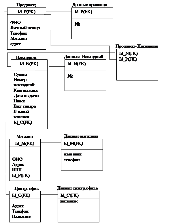 Рисунок 3.1- Реляционная модель 3. Нормализация Нормализация – это процесс, позволяющий гарантировать эффективность структур данных в реляционной базе данных. Первая нормальная форма требует, чтобы все значения полей были атомарными и все записи уникальными. Реляционная модель представленная на рисунке 3.1 находится в первой нормальной форме. Модель находится во второй нормальной форме, если она, во-первых, находиться в первой нормальной форме; и, во-вторых, не содержит неключевых атрибутов, находящихся в частичной функциональной зависимости от первичного ключа. Исходя из определения, разбиваем таблицу “продавец” на две таблицы, вторую образовавшеюся таблицу назовем “данные продавца”. В таблице “продавец ” у нас остался только один идентификатор “id_P” значит неключевые атрибуты зависят от всего первичного ключа. В таблице “данные продавца” нет неключевых атрибутов, значит частичной зависимости быть не может. Таким же образом разбиваем таблицы “магазин”, “накладная” и “центр офис”. Реляционная модель во второй нормальной форме представлена на рисунке 4.1. Модель находится в третьей нормальной форме, если она находится во второй нормальной форме и не имеет транзитивных зависимостей. Транзитивная зависимость – это зависимость между неключевыми атрибутами. Таким образом, выделяем из таблицы “продавец” неключевые атрибуты “телефон” и “адрес”, которые находятся в зависимости, в отдельную таблицу “описание продавца”. Получаем модель в третьей нормальной форме, которая представлена на рисунке 4.2.