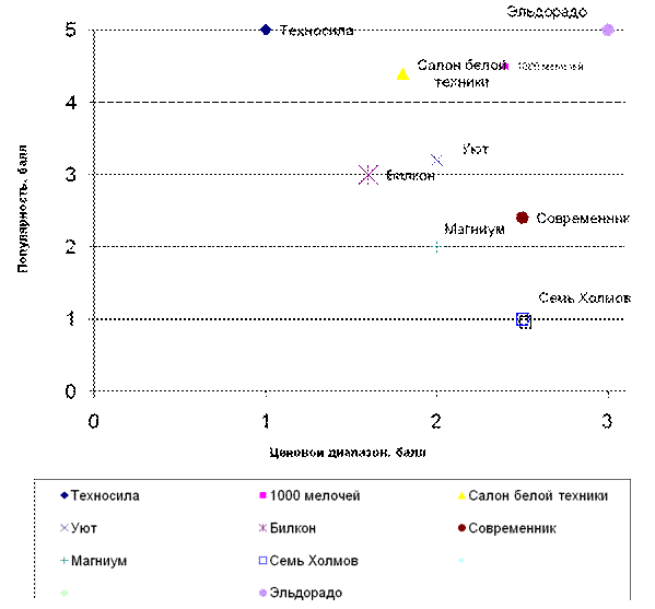 С учетом категории магазина, географического расположения и популярности, к наиболее значимыми конкурентами ООО «Билкон» можно отнести Эльдорадо, Техносила, 1000 мелочей и Салон белой техники. Позиционирование магазинов по популярности и ценовому диапазону представлено на рис. 2.2.