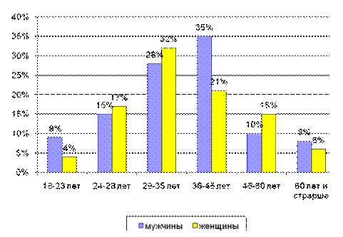 В целях определения поведенческих особенностей представителей данного сегмента проведем оценку по таким характеристикам, как: - способы проведения досуга; - частота поездок за границу; - пользование Интеренет. Для определения основного сегмента было проведено исследование, которое включало в себя опрос 100 респондентов. В качестве инструмента сбора первичной информации была разработана анкета, которая предназначалась для посетителей магазинаа. Полученные данные были обработаны и объединены, таким образом, в целом проведено выборочное анкетирование 100 человек. Следует заметить, что с увеличением объёма выборки вероятность искажений уменьшается и погрешностью выборки можно пренебрегать. Исследование структуры потребителей на основе демографических факторов (рис. 2.4.) выявило следующую картину: данные по половозрастной структуре показывают, что среди посетителей магазина прмероно одинаковая доля мужчин (51%) и женщин (49%), причем в возрастной группе от 29 до 45 лет.