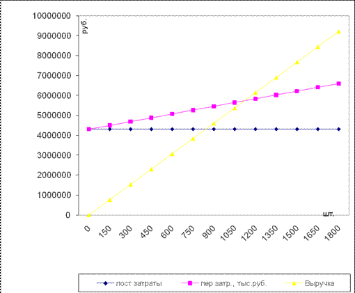 Таким образом, на конец периода в распоряжении предприятия остается остаток денежных средств в размере 5736 тыс. руб., который предприятие может направить на приобретение основных средств, расширение ассортимента, проведение дополнительных рекламных мероприятий и выплату дополнительных премий сотрудникам. 6. ОЦЕНКА РИСКОВ Основные факторы роста рынка: увеличение реальных доходов населения и развитие потребительского кредитования. Однако последний фактор является одновременно и препятствием к дальнейшему росту. В течение последних лет значительная часть бытовой техники была куплена населением на средства потребительских кредитов, которые сейчас и еще несколько лет будут выплачиваться. При этом достигнута задача обновления минимально необходимого набора техники. Основными и самыми яркими тенденциями на рынке стали рост конкуренции благодаря приходу крупных торговых иностранных компаний, а также иностранных производителей, которые все чаще объявляют о размещении своих производств на территории России. Непредсказуемость покупательского спроса Продажи бытовой техники уже в 2011 году имеют предпосылки для выхода на докризисный уровень, однако расстановка сил на рынке может измениться в результате усиления борьбы на новом поле продаж – через интернет 7. ОЦЕНКА ЭКОНОМИЧЕСКОЙ ЭФФЕКТИВНОСТИ БИЗНЕС – ПЛАНА В качестве основного показателя эффективности бизнес-плана принято рассматривать показатель точки безубыточности. Размер прибылей и убытков в значительной степени зависит от уровня продаж, который обычно является величиной, трудно прогнозируемой с определенной точностью. Для того, чтобы знать, какой потребуется уровень продаж для достижения прибыльности предприятия, необходимо провести анализ безубыточности. Анализ безубыточности позволяет ответить на вопрос: “Cколько нужно продать продукции, чтобы предприятие стало прибыльным?” Каждый раз, когда продается продукция, часть выручки идет на покрытие фиксированных затрат: эта часть, названная валовой прибылью, равна цене продажи за минусом прямых затрат. Поэтому для проведения анализа валовая прибыль должна быть умножена на количество проданной продукции: точка безубыточности достигается в том случае, когда общая валовая прибыль становится равной постоянным затратам. Исходя из имеющихся данных, построен график безубыточности для ООО «Билкон» (рис. 7.1.). В данном графике объем реализации приведен по всей продукции, рассчитанный на основе средней цены. Расчет точки безубыточности в натуральном выражении рассчитывается по формуле: