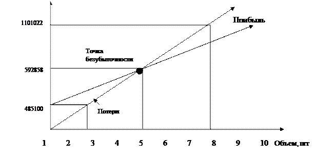 Критический объем реализации = 1101022 : (84694 – 69300) = 7 шт. Порог рентабельности = 7 шт. ∙ 84694 = 592858 руб. Маржа безопасности = 13 шт. – 7шт. = 6 шт. Таким образом, при объеме реализации 7 шт. и выручке от реализации 592858 руб. предприятие возмещает все затраты и расходы полученными доходами, при этом прибыль предприятия равна нулю. Изобразим точку безубыточности на графике
