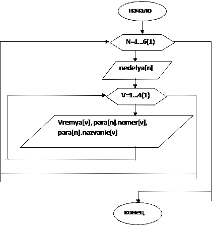 Writeln(vremya[v],’-‘,para[n].nomer[v],’-‘,para[n].nazvanie[v]);