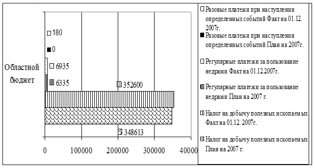 Фактическое поступление платежей за пользование недрами соответствует прогнозным показателям, что позволяет сделать вывод о реальном прогнозировании бюджета в части поступления платежей за пользование недрами и Платежи и сборы по аукционам на предоставление прав пользования месторождениями общераспространенных полезных ископаемых, переоформление лицензий составили за 2007 г. составили 1 632,6 тыс. руб. [31]. Несмотря на то, что доля налогов и сборов за пользование природными ресурсами в областном бюджете составляет 1,7% (302 114,9 тыс. руб. – по состоянию на 2007 год) в общей сумме налоговых доходов (17 471 800,9 тыс. руб.), однако существуют очень серьезные проблемы, связанные с добычей полезных ископаемых на территории области, края [36]. Наиболее понятна данная таблица при демонстрации следующих рисунков (рис. 3.7 и 3.8) [34]. Одной из серьезных проблем является экологическая проблема использования природно – ресурсного потенциала. XX век стал веком углубляющегося экологического кризиса, веком столкновения природы и ее естественных законов развития с законами цивилизации, которые на сегодняшний день не обеспечивают должной охраны окружающей среды и экологической безопасности. Несмотря на то, что, начиная с 90-х годов в России происходил спад производства, состояние окружающей среды все еще продолжает ухудшаться. Немалую роль в процессе деградации природной среды и ухудшения здоровья населения играет промышленное производство, и в частности химическая отрасль, которая только по объему сброса загрязненных сточных вод занимает второе место среди промышленных производств. В 2007 году показатели сброса в водные объекты выросли на 119 млн. куб.м. по сравнению с 2006 годом. Более четверти отраслевых выбросов вредных веществ приходится на предприятия, расположенные в Татарстане, Башкортостане, Мурманской и Иркутской областях [22, с. 56-60].