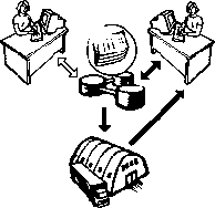 Согласно рис.3 в первой фирме (компании) сохраняется стыковочный шлюз с системой управления, а во второй фирме внутренняя система управления не связана с Интернетом. Следовательно, в этом случае отсутствует автоматический обмен данными с первой фирмой. Между тем вторая фирма может взаимодействовать с первой через своих менеджеров («вручную»). Менеджеры могут общаться с первой фирмой с помощью некоторого интерфейса (например, браузера). Менеджеры могут получать (например, по электронной почте или через браузер) необходимую информацию от первой фирмы, а затем вносить данные в свою систему управления, осуществлять свой бизнес-процесс. Менеджеры второй фирмы выступают в качестве потребителей первой фирмы. Особенностями второй модели организации электронной коммерции – бизнес-потребитель – являются следующие: