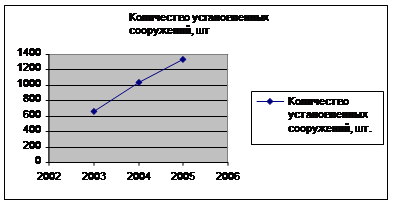 Рисунок 2.2 – Динамика созданных передовых технологий Происходят качественные изменения материала (керамическая плитка улучшенного качества, очистительные сооружения новых разработок) и технологии его изготовления, разрабатываются новые дизайнерские проекты, что влечет за собой увеличение ассортимента и в какой-то степени подорожание услуг предприятия. Процесс изучения технологического макроокружения способствует выбору таких решений, которые позволяют подстроиться посредническим фирмам (к которым относится ООО «Роса - Красноярск») под изменяющиеся запросы покупателей. Экономические факторы. Анализ экономического макроокружения позволяет понять то, как формируются и распределяются ресурсы. Это является жизненно важным для предприятия, так как доступ к ресурсам очень сильно определяет состояние входа в организацию. К показателям, влияющим на деятельность ООО «Роса - Красноярск» можно отнести: - экономическое состояние страны в целом; - уровень цен на используемые материалы; - уровень денежных доходов населения и прибыли предприятий; - темпы инфляции; - производительность труда; - нормы налогообложения; - пути увеличения продаж и максимизации прибыли организации; - процентная ставка банковских учреждений. Экономическое состояние страны в целом стоит рассматривать в аспекте инфляции. В данный момент в РФ наблюдается инфляция спроса, поэтому денежные средства у населения изымаются всеми способами: снижаются зарплаты, «убираются» премии, сворачиваются соцпрограммы. В 2005 году инфляция в России составила 11,7%, в 2006 году по данным Росстата инфляция на январь-октябрь составила 9,2%, что несколько ниже чем в 2005 году за этот же период. Известна инфляция на первые три месяца 2007 года: январь 1,7%, февраль 0,8% и март 0,7% Таким образом, на начало 2007 года инфляция составила всего 3,2%, тогда как на начало 2006 года она составила 4,9%. Снижающиеся темпы инфляции влекут за собой повышение тарифной ставки и повышение курса национальной валюты, это может стабилизировать растущие цены на продукцию, что увеличивает покупательную способность субъектов и сдержат рост цен на сырье. Анализ финансово-экономической устойчивости является важной и актуальной проблемой, как отдельного предприятия, так и России в целом. Финансово устойчивым является такой хозяйствующий субъект, который за счет собственных средств покрывает средства, вложенные в активы, не допускает неоправданной дебиторской задолженности и расплачивается в срок по своим обязательствам. Основой финансовой устойчивости являются рациональная организация и использование оборотных средств. Если рассматривать рынок установки очистительных сооружений в целом, можно отметить рост потребности в этом (рис.2.1). так как очистительные сооружения устанавливаются, как правило, в развлекательных досуговых организациях, а также в частных домах состоятельных граждан, это говорит о развитии этой отрасли в регионе.