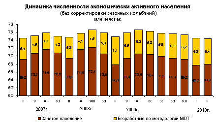Общая численность безработных, классифицируемых в соответствии с критериями МОТ, в 2,8 раза превышает численность безработных, зарегистрированных в государственных учреждениях службы занятости населения. В конце февраля 2010г. численность безработных, зарегистрированных в государственных учреждениях службы занятости населения, составила 2295 тыс.человек.