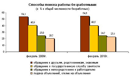____________________ Одна из причин таких отклонений - это методологические различия в части охвата категорий населения. Так, в составе общей численности безработных, классифицируемых в соответствии с критериями МОТ, в феврале 2010г. около 0,6 млн. человек, или 10% составляли граждане, которые не могут быть признаны безработными в органах службы занятости населения. Среди них 42% составляли лица старше или моложе трудоспособного возраста, 39% - студенты и учащиеся в трудоспособном возрасте очных образовательных учреждений и 19% - лица в трудоспособном возрасте, получающие пенсии за выслугу лет или на льготных условиях. Все эти категории в обследуемый период не имели работы, занимались поиском работы и были готовы приступить к ней, т.е. отвечали критериям для отнесения их к безработным по методологии МОТ. Кроме различий методологического характера, которые влияют на сравнимость размеров безработицы по данным обследований населения по проблемам занятости и данным административного учета службы занятости населения, имеются причины скорее субъективного характера, связанные с предпочтениями незанятого населения в выборе способов поиска работы.